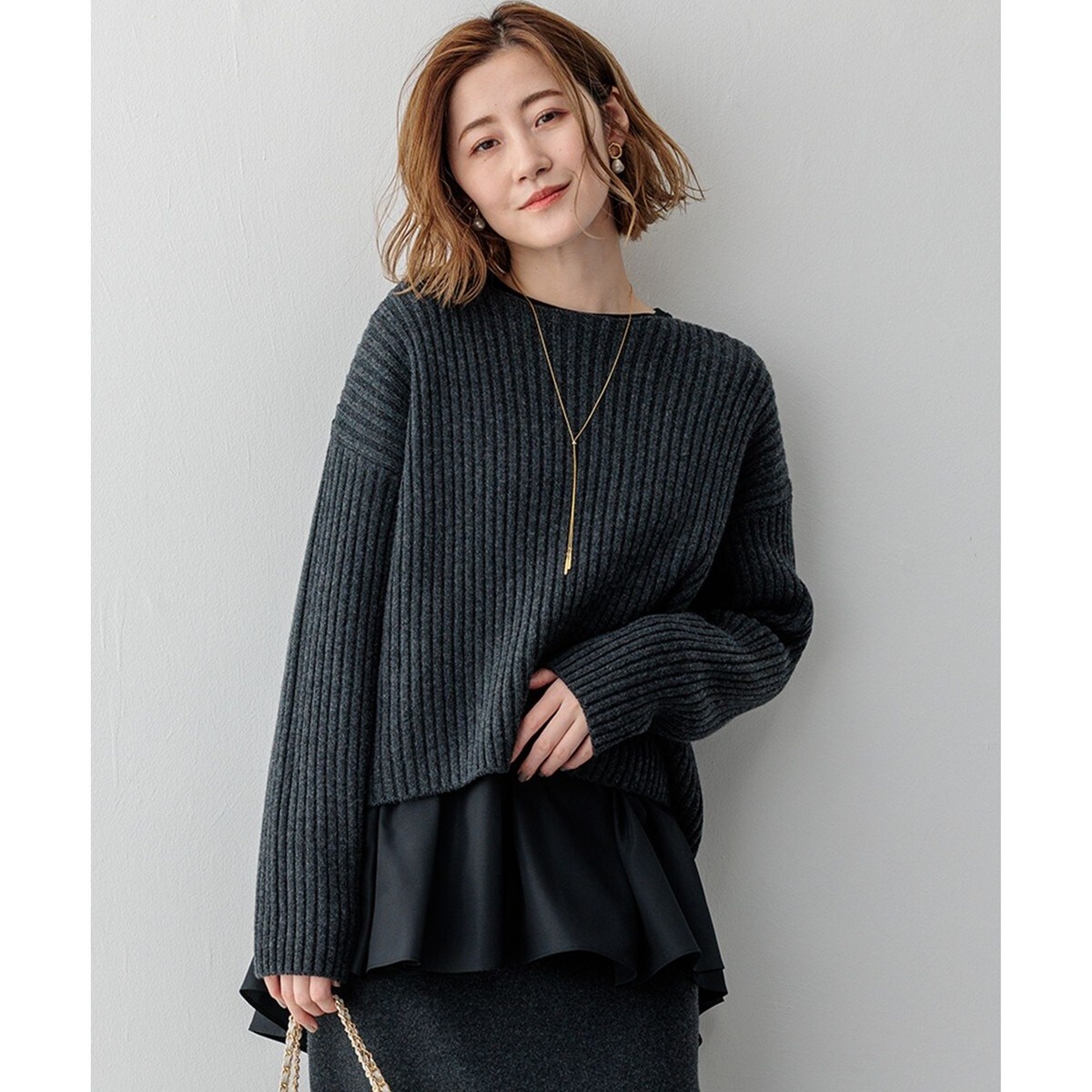 甘めに編むことで軽さを出したリブベースのクロップドニット。一枚で着ても、カットソーやシャツとレイヤードしても、バランスがとりやすいよう短すぎない丈感に仕上げました。ややワイドめの身幅で抜け感が出るのもポイント。様々な着方が楽しめる一枚です。カラーは、カジュアルなライトグレー(#003)、落ち着いたグレー(#004)、やさしい印象のベージュ(#033)、深みのあるグリーン(#060)の4色展開です。