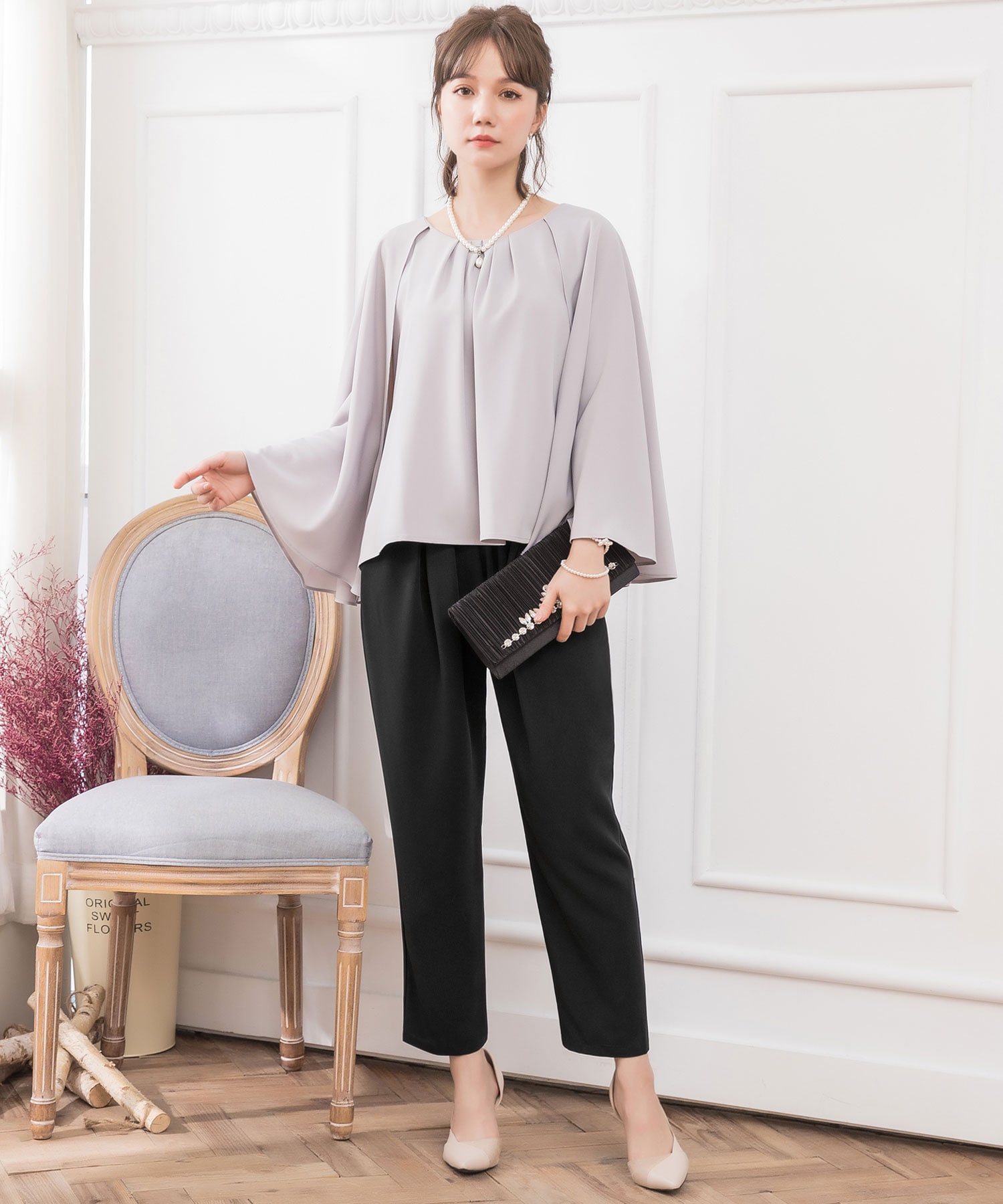 レディースセットアップ トップス パンツ ケープつき グレー XL