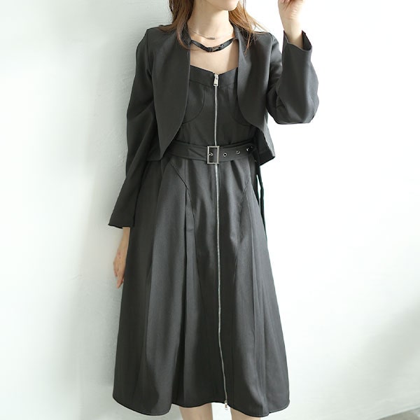 ノーカラージャケットとキャミソールワンピースのセットアイテムです。ノーカラージャケットはショート丈で脚長見せができ、胸元におしゃれな留め具があります。キャミソールワンピースはバックシャーリングデザインで、上半身をコンパクト見せ。ダブルファスナー&ベルト付きのオシャレ度の高い一枚です。コーデ迷子の頼れる味方、キレイが完成するセットアイテムは持っておくと便利☆