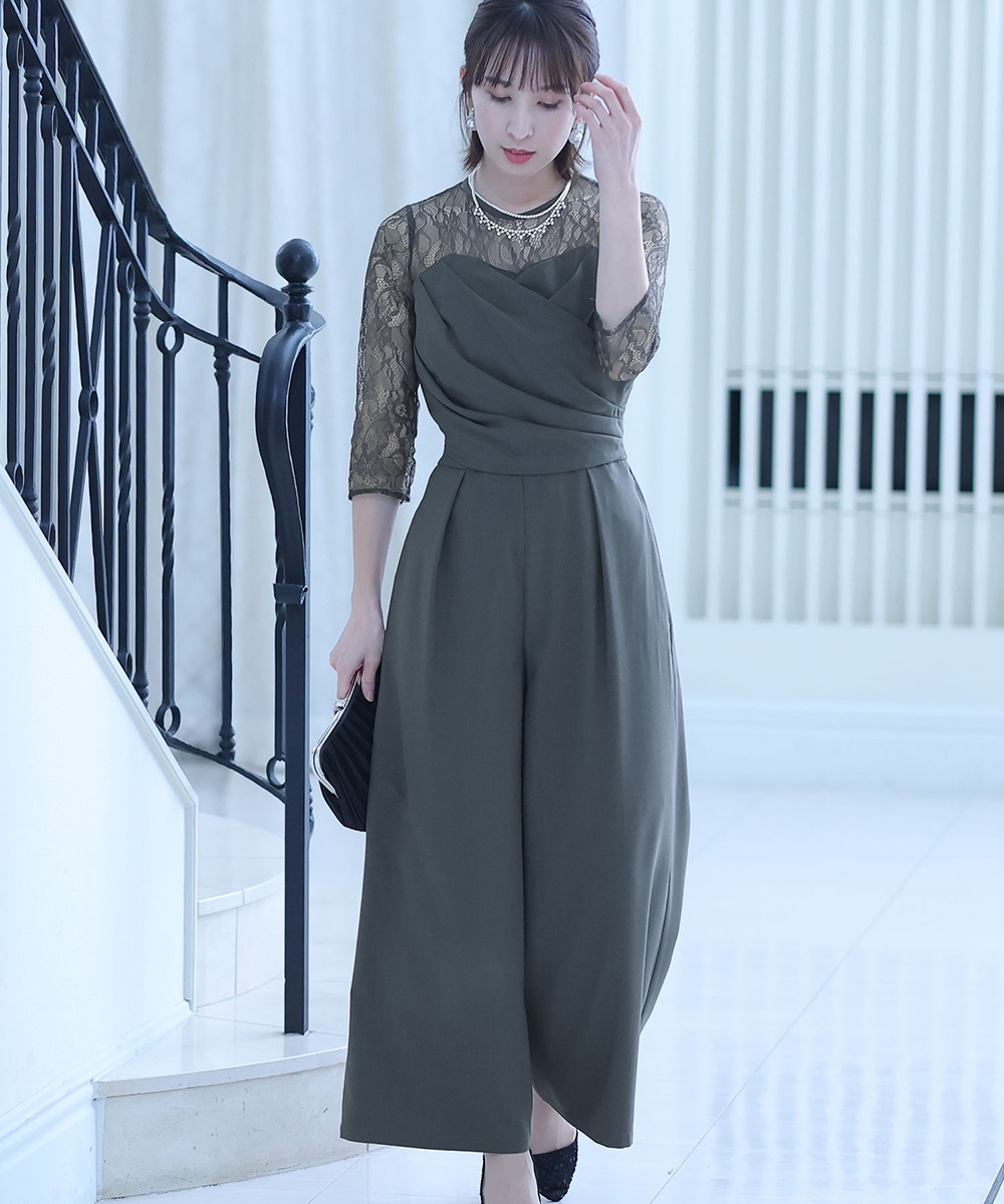 花柄のレースが肌に透けて華やかな印象に。ネックレス無しでもお洒落な1着。
