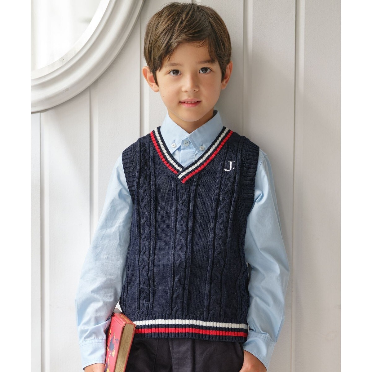 配色ラインとケーブルラインが表情豊かなチルデンニットベストです。普段のコーデにプラスするだけで、季節感のあるトラッドな着こなしに♪シャツときれいめなボトムスでコーディネートすれば、学校行事やお呼ばれにも対応できる万能アイテムです。Vネック部分と裾に施した異なる2色の配色ラインとケーブルライン、胸元の「J」刺繍ロゴがワンポイントになっています。ベーシックなデザインなのでユニセックスでお使いいただけます。ジャケットを羽織ってもラインがちらっと見えて程良いアクセントに。
