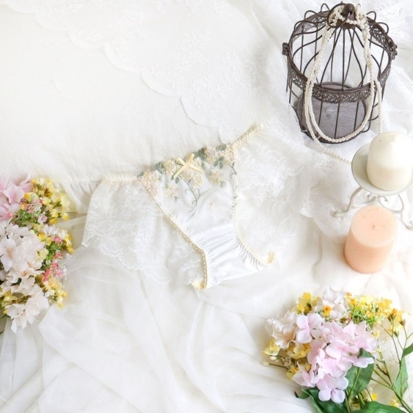 後身生地は総レースになっており、伸縮性のあるレースが肌に心地よくフィットします。足口にはゴムを使っていないので食い込まず、少しゆとりをもった履き心地です。ボトムスへもショーツラインが響きません。