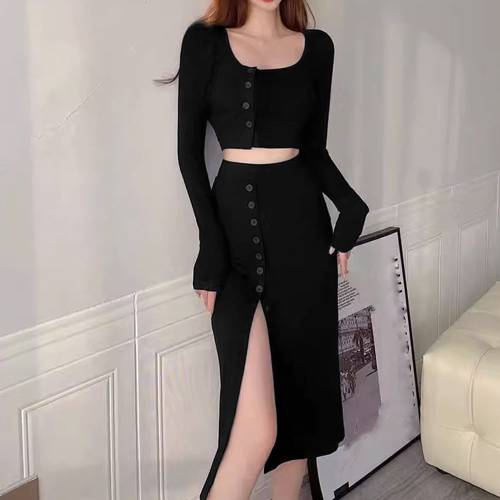 ショート丈トップス+ボタン開きスリット入りタイトスカートの2点ニットセットが登場