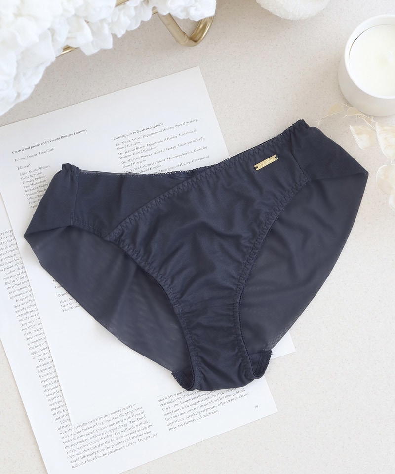 お揃いのブラと同じ軽やかなチュールネットをアクセントに使用したショーツは、ヒップ全体を優雅に包み込み、シルエットを美しく整えるフルバックデザインで日常使いに最適。