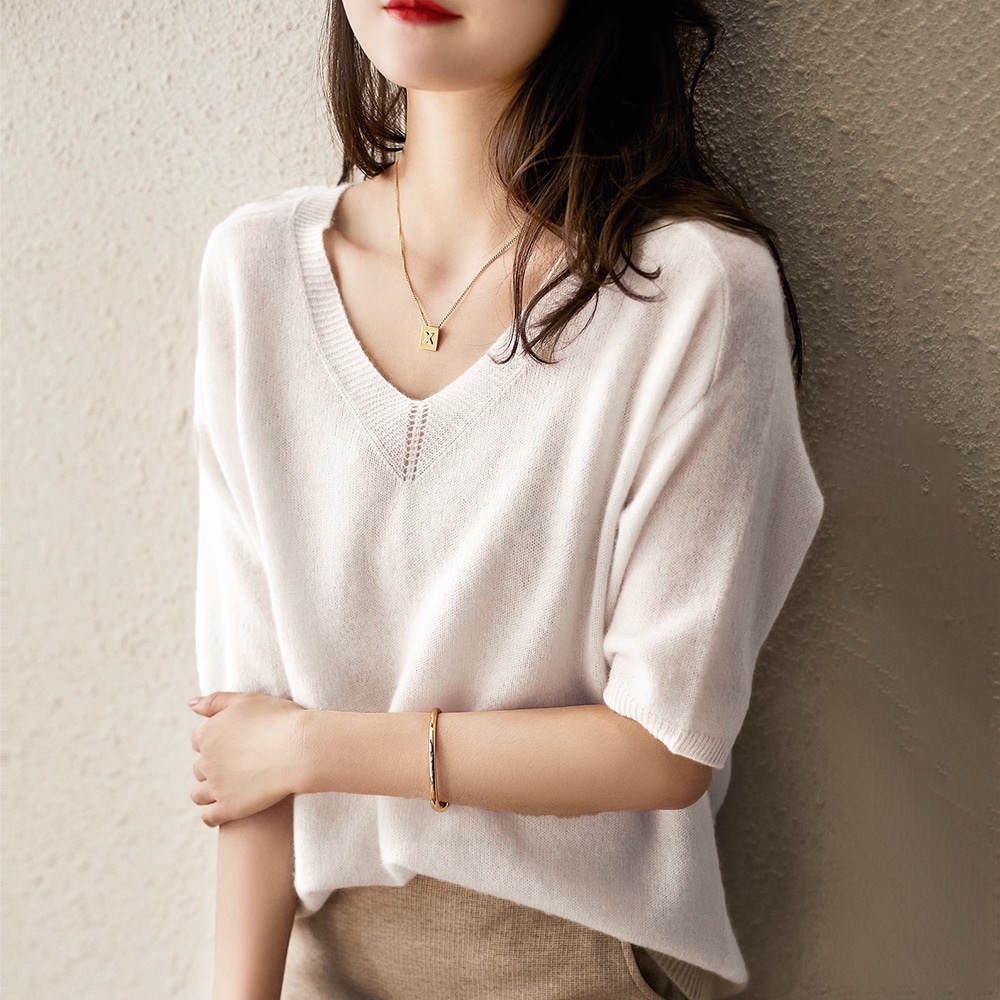 サマーニット 半袖ニット Vネック トップス 半袖 ニット レディース 五分袖 ゆったり