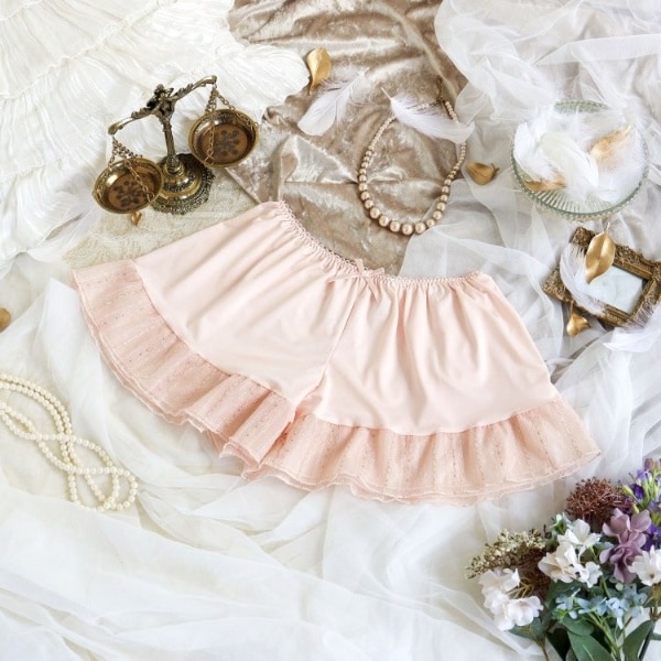 お揃いのキャミソールとのコーディネートで、より豪華でエレガントな世界観を演出します。色展開は落ち着きのあるニュアンスカラーで、優美な女性らしさを表現しました。