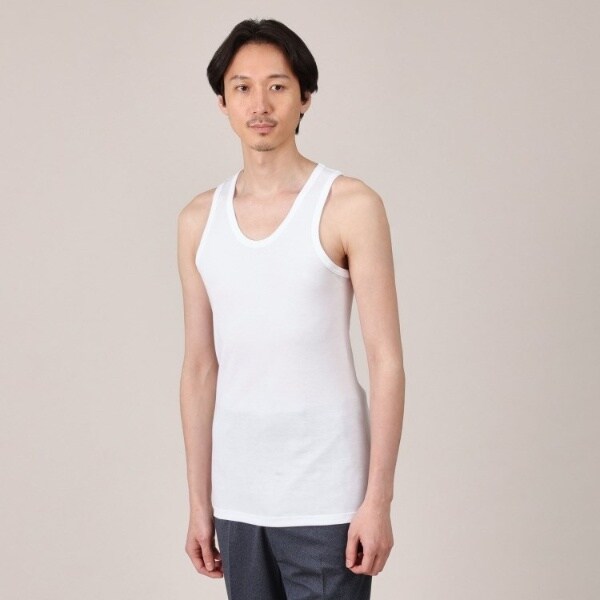 シャツのインナーとして、ビジネスシーンにも活躍するベーシックタンクトップ。