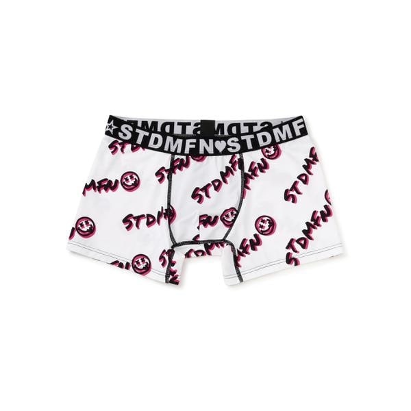 フラッシュカラーを差し色にしたグラフィティ柄のオリジナルテキスタイル ストレッチナイロン素材のアンダーウェア。フロント部分は2重に、裏側はメッシュを採用した着用感にも拘った1枚。ウエストゴムもオリジナルSTDMFNジャガード柄を使用しています。