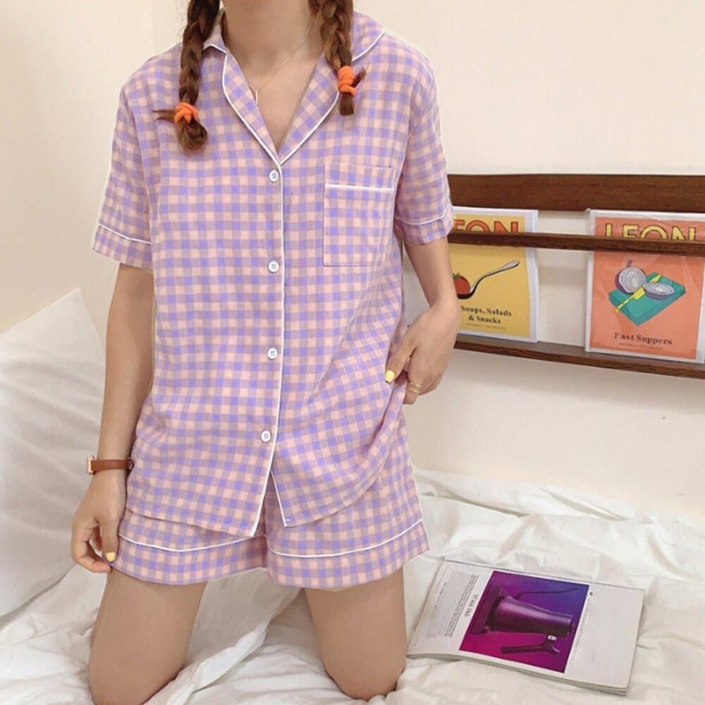さらっと軽やかな綿混生地に定番なチェック柄のオトナ女子用サマールームウェア上下2点セット