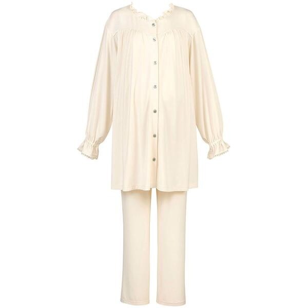 【マタニティパジャマ(産前・産後兼用)】トップス袖丈:長袖(10分袖)・ボトム脇丈:長ズボン(10分丈)・授乳あき付き●マタニティの体型変化を考慮したリラックスシーンにぴったりのパターンで妊娠中も産後も快適に着用できる●授乳あき付きの前あきタイプで授乳も簡単●ボトムはマタニティ用の設計でおなかもすっぽり●ボトムウエストに高伸度ゴムを使用し、ラクなはきごこち●ウエストゴム取り替え口あり●本体は伸びがよくやわらかい触感のレーヨンベア天竺素材を使用●ネックや袖口のフリルデザインがやさしく上品な印象●バスト上辺にたっぷりギャザーを入れることで、バストが大きくなってもゆったり着られるデザイン●ボトムにポケットあり※お洗濯は、必ず「取扱い表示」にしたがってください。