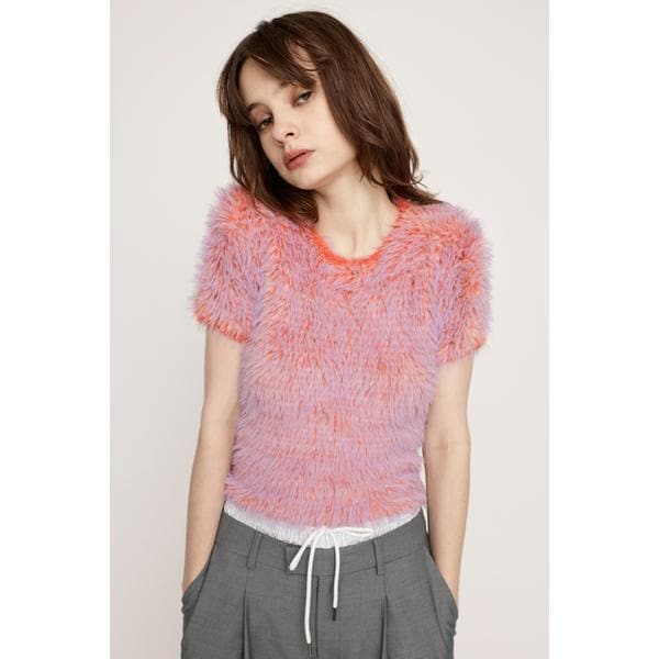 【MIX SHAGGY TINY T/SH】■POINT:毛足の違うニットシャギー素材をオリジナルカラーでミックスした半袖トップス。■DETAIL:毛足が長めのふわふわした表面感が着用するだけで様になります。コンパクトなサイズ感のTシャツ型なので、今の時期から重宝するアイテムです。■STYLING:目を惹くアイテムなので、シンプルなボトムに合わせるのがおすすめ。■FABRIC/MATERIAL:肌触りの良いシャギー素材を使用。※本製品は編地と素材の特性上、サイズが非常に不安定です。サイズの個体差が生じることがありますが、製品に問題はありません。また、長時間ハンガー等に吊るしておくと、寸法に大きな変化が生じる可能性があるため、取り扱いには十分ご注意ください。本品には毛羽や毛足のある素材を使用しております。ご使用中に加わる摩擦や磨耗によって、多少の毛羽抜けや毛羽乱れが生じる事があります。素材特性上、完全に防ぐ事ができませんのでご了承下さい。抜けた毛羽が他の物に付着する事があります。その際はエチケットブラシ・粘着テープ等で取り除いて下さい。濃色は毛羽の付着が目立ちますので、できるだけ同系色のものとの組み合わせをおすすめいたします。※商品画像はサンプルのため、色味やサイズ、素材の混率等の仕様に変更がある場合がございますので、予めご了承ください。※一部予約商品につきましては生産上の都合によりお届け予定日や店頭発売と前後する場合もございます。※追加生産商品は、一部の店舗、通販で販売中の場合がございます。予めご了承下さい。