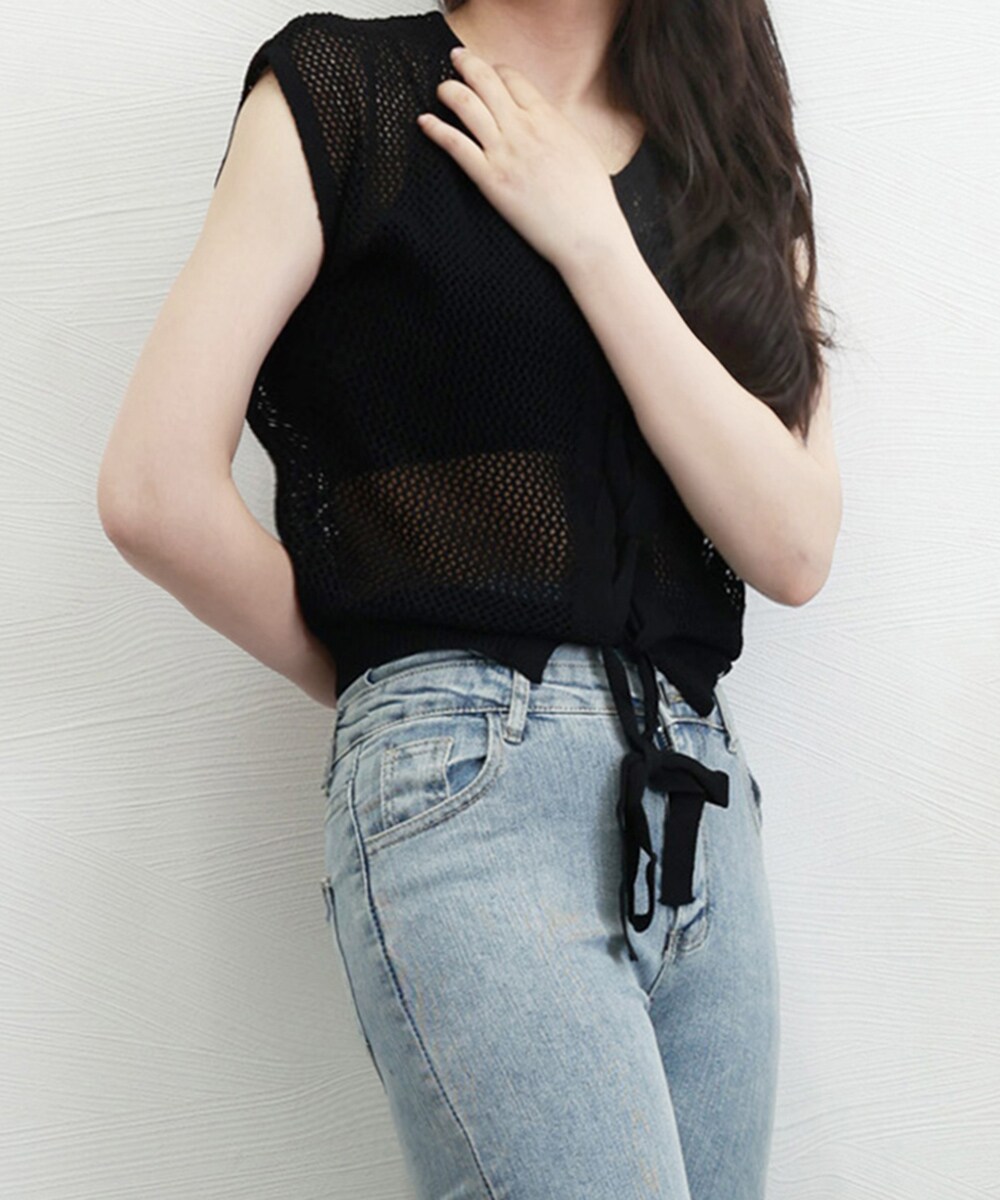 メッシュ編みが施された、肌を美しく透かす繊細なデザインのニットトップス