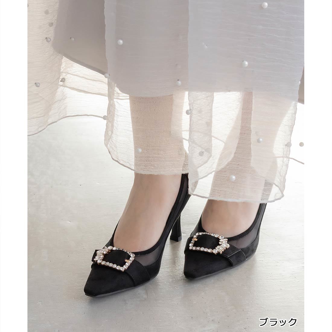 ビジューバックル ポインテッドトゥ ローヒールパンプス ブラック