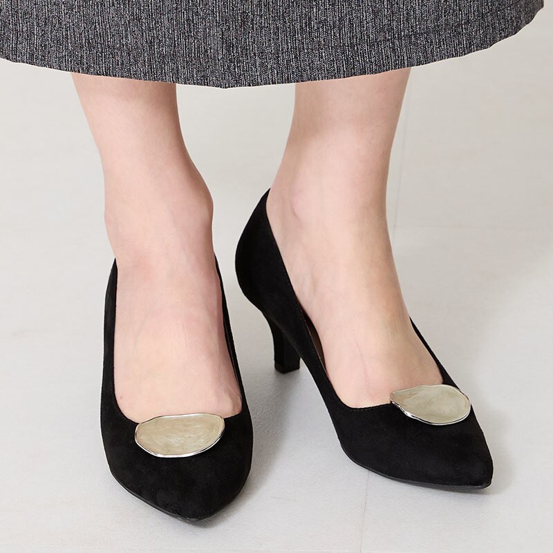 プレートモチーフが高級感あふれるパンプスは、華奢なヒールに細身のポインテッドトゥで美しいシルエットが叶う1足。