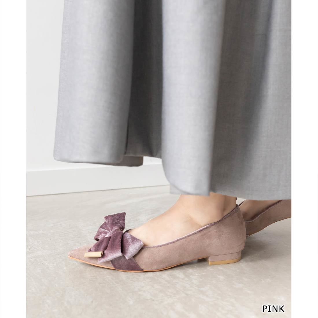 ベロア素材 青色リボン付きフラットバレエシューズ 25cm