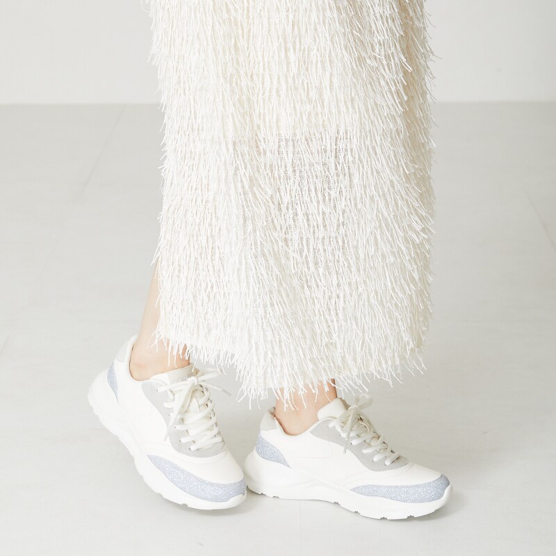 グリッターの切り替えが目を引くスニーカーは細かいラメで派手過ぎず日常使いしやすいデザイン。