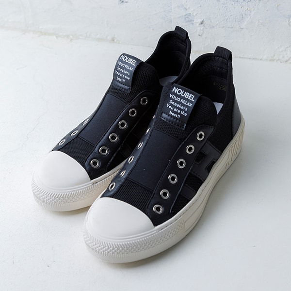 靴ひもの代わりにゴムでしっかり甲をサポートし、お洒落さと、スムーズな着脱をアシストします。
