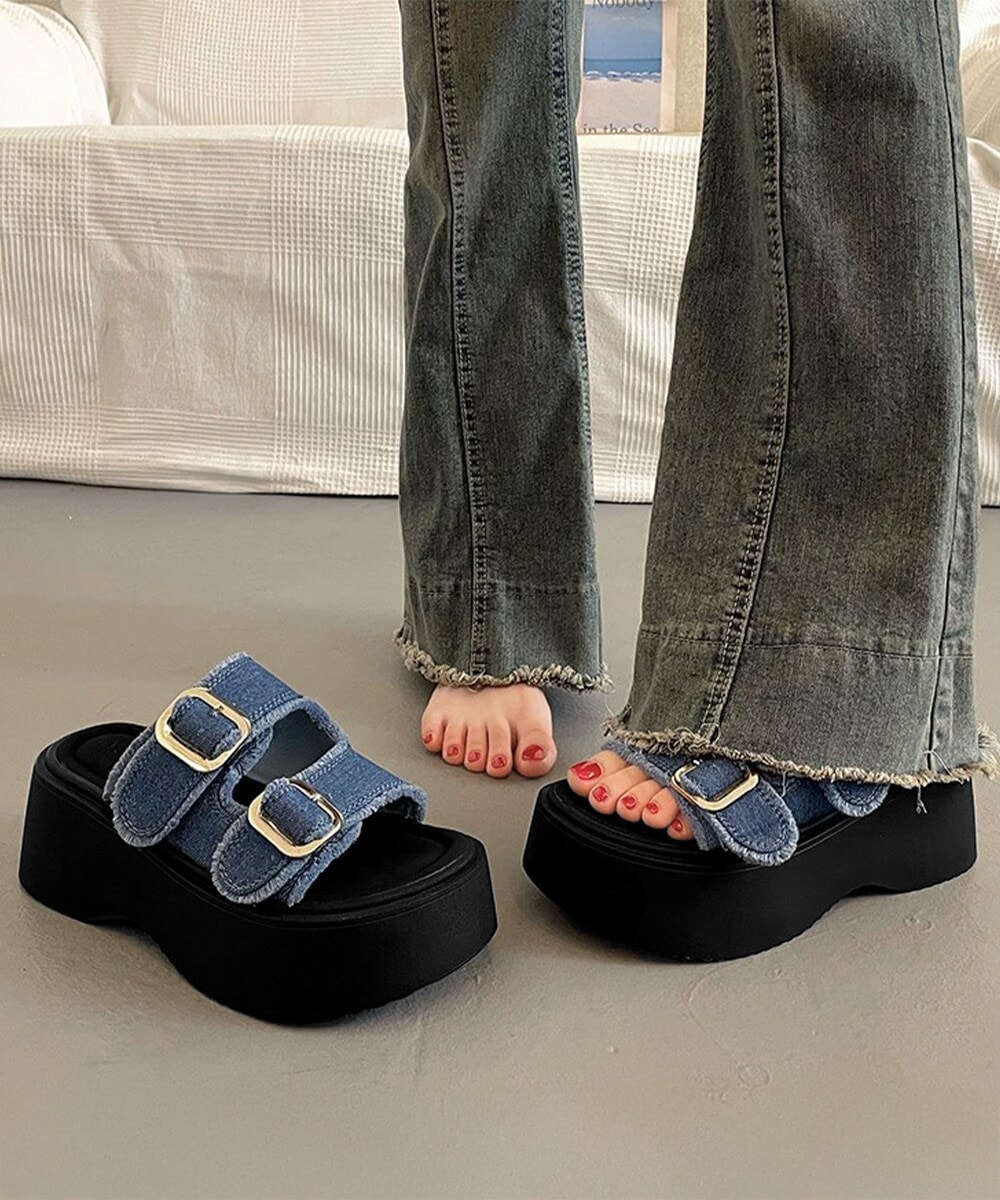 トレンド感溢れるダブルバックルデザインのプラットフォームサンダル。