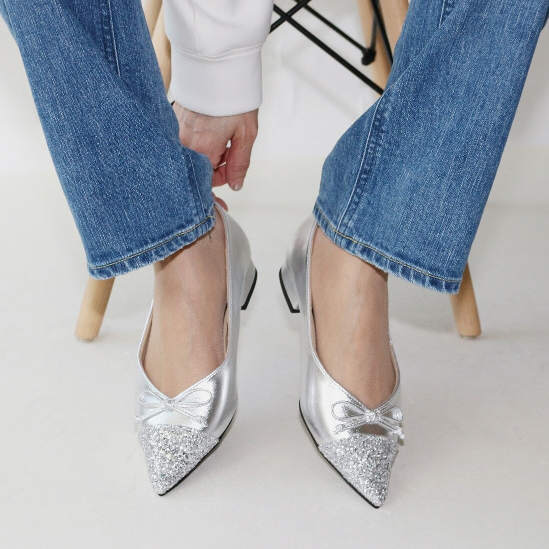 すっきりとしたポインテッドトゥにVカットデザインがすらっとした足元を演出するFin(フィン)のグリッタートゥキャップバレエシューズが登場。Vカットの深めの履き口がシャープな中にぬくもりのあるエレガントな雰囲気を演出します。2.3cmのヒールやカットラインなど、足元全体のバランス感がシルエットの綺麗なスタイリングを完成させてくれます。つま先のグリッターがキラキラしていて春夏の装いにピッタリです。