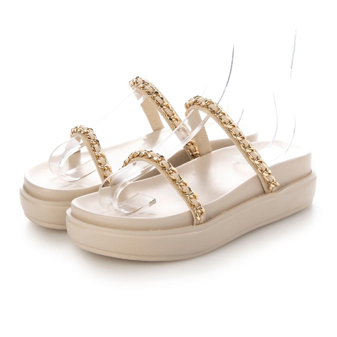 コメント:私は足長が23.2cmなのでMサイズだといつも少し余裕がありますが、ゆったりした履き心地が好きなので普段23.5cmもしくはMサイズを着用します。アッパーのベルトは細すぎないので食い込むこともなく、見た目以上にとても楽に履けました!とても軽量な厚底ソールで、長時間のお出かけやご旅行にもおすすめです。アッパーのチェーンがアクセントになり、シンプルなコーデやリゾートスタイルにも良さそうです。