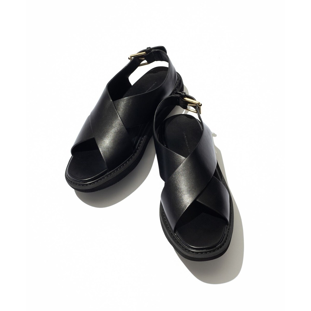 太バンドのクロスデザインサンダルです。足の露出が少なく合わせやすいデザインになっています。素足でもソックスを合わせてもスタイリングして頂けるので、デイリーに幅広く活躍してくれます。バックル部分にはゴムを入れていているので、脱ぎ履きがしやすいのもポイント。ソールは少しふっくらとしたシルエットになっていて、ゴツくなりすぎず柔らかい印象です。艶のあるスムースの合成皮革を使用しているので、きれいめなスタイリングにもマッチします。