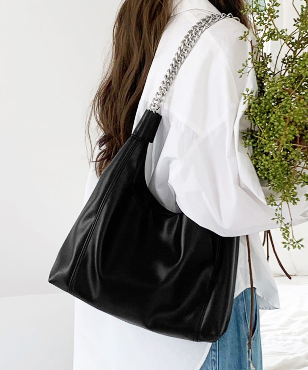 光沢のある上質な素材感で、カジュアルからフォーマルまで幅広く活躍するチェーントートバッグ