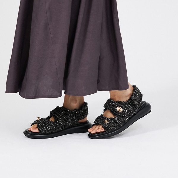 型押しやサマーツィード等こだわりの素材や金具使いがリッチな雰囲気で、程よくカジュアルで大人っぽくきちんと感もある1足。
