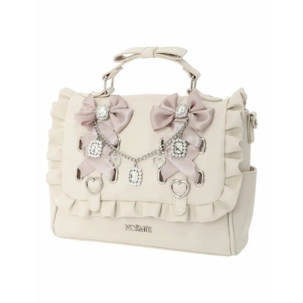 フラップ部分にはフリルが施され、リボンやハートベルトで愛らしさたっぷりなデザインに◎