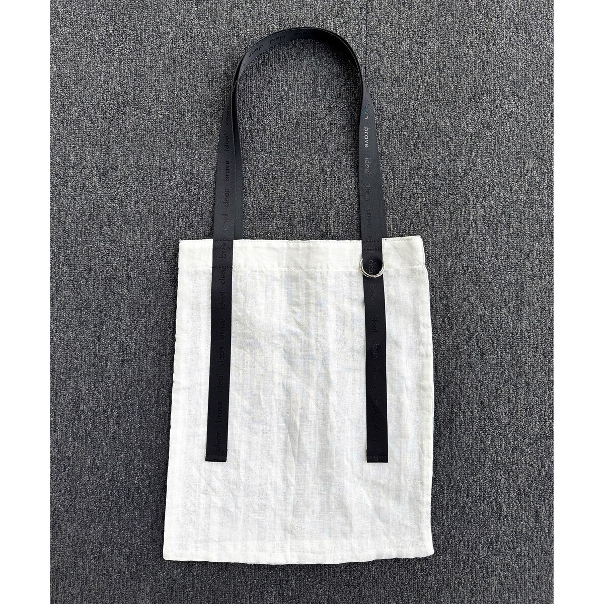 ■デザインメインバッグとしてはもちろん、サブバッグとしてもお使いいただきやすいトートバッグです。今回は、ワントーン見えやバイカラー見えのストライプ生地を使用しており、大人ぽく仕上げながらもシーズン感があり、リラックスした雰囲気のデザインとなっております。ハンドルのさりげないロゴプリントがポイント。正面ハンドルには丸カラビナが付いており、キーチャームやイヤホンケースなどを掛けることが可能です。A4サイズも入る便利な大きさです。
