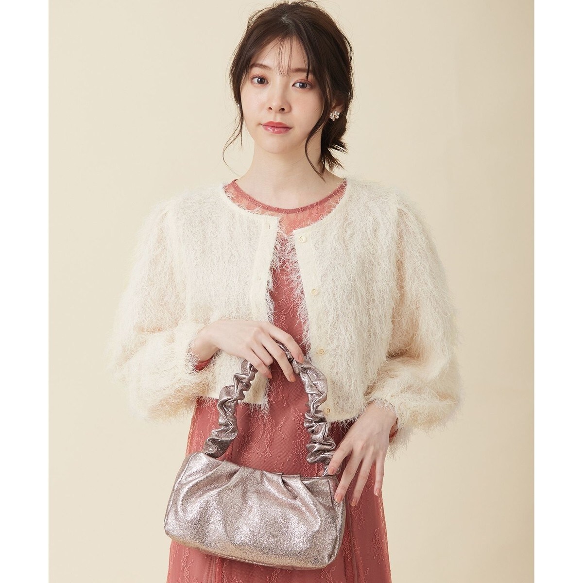 ラメ感のある生地でトレンドのシャーリングハンドルを施した華やかなバッグです。タックも入っておりふわっと触り心地が良いのもポイントです。取り外しチェーン付きなのでコーデに合わせて持ち方も変えられます。