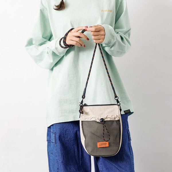 所持品が程よく入る大きさは普段使いに適しています。ナチュラルな印象のナイロン素材が馴染むアイテムです。