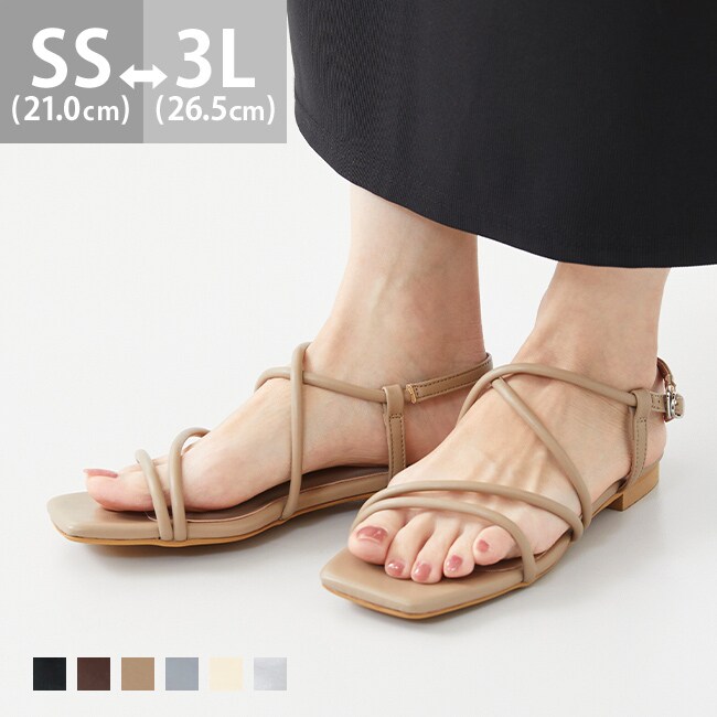 合成皮革/人工皮革 / 無地 / 25.0cm以上あり / 22.0cm以下あり / 2.5cm未満 / フラットヒール / ふつう(D・E・2E) / スクエアトゥ / ストラップサンダル / カジュアル / 中敷クッション入り / 滑りにくい靴底 / ゴム底/合成底