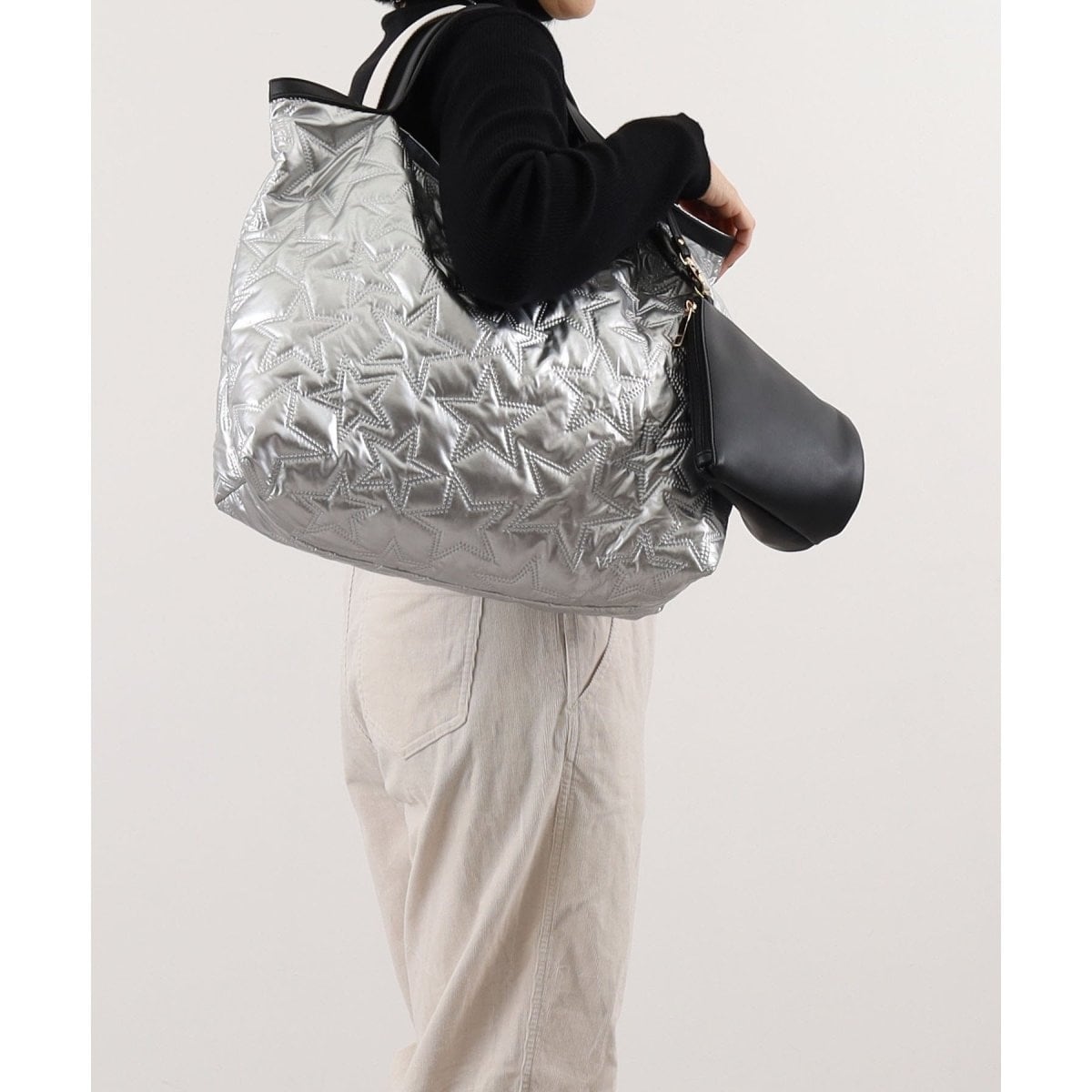 シャイニーな生地に星柄のキルティングを施したトートバッグシンプルな形ですが、