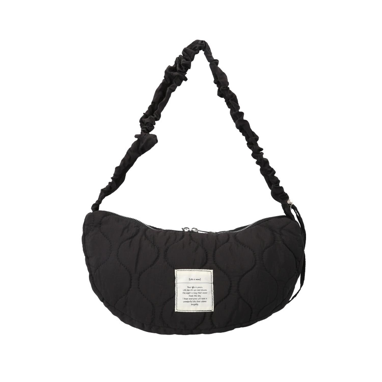 【持っていればヘビロテ間違いなし】使いやすくデザイン性も♪「Rename キルティング ギャザー ショルダーバッグ」。【カジュアルな中に可愛さをプラス】ひょうたん柄のキルティングに、ショルダーはクシュクシュっとしたギャザーデザイン☆【絶妙な抜け感でこなれ度アップ】キメ細やかで、サラッとエアリーな生地。落ち着いた光沢感でカジュアルになりすぎない♪【両手が空いて移動がラクラク】ショルダーをキュッと絞って長さ調節。肩掛けも斜め掛けもできて、アクティブシーンでも快適◎【ガバっと開くダブルファスナー】左右どちらからもオープン!取り出しやすく、ファスナーを閉じればプライバシーを確保。【マストアイテムをひとまとめ】長財布や500mlペットボトルが横向きに。コンパクトに見えて必要な物はしっかりと。【サクッと取り出せて迷子知らず】合計3つのポケットを配置。細々とした物も、バッグの中で探す手間が不要。【体に負担をかけずストレスフリー】ふんわりとした質感。手軽に持ち出せる軽量設計&ボディラインにフィットするハーフムーン型。【飽きが来ず長く愛用できるデザイン】コーデに馴染むベーシックカラー。フロントには”Life is mine”のタグを。【ポケット仕様】内側:オープンポケット×1、ファスナーポケット×1背面:マグネットポケット×1