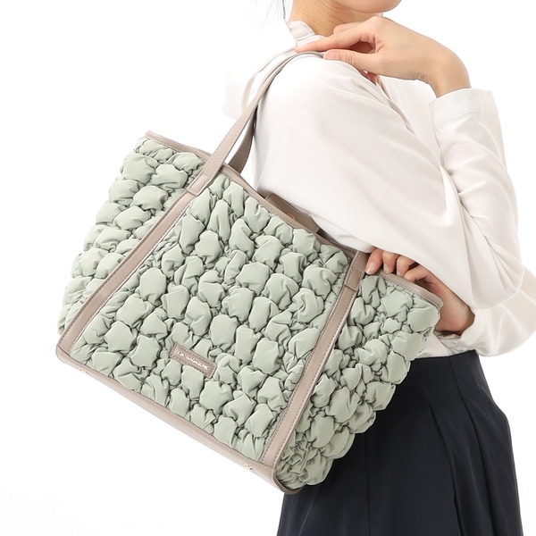 くしゅくしゅとした表面感のキルティングが印象的なトートバッグ。