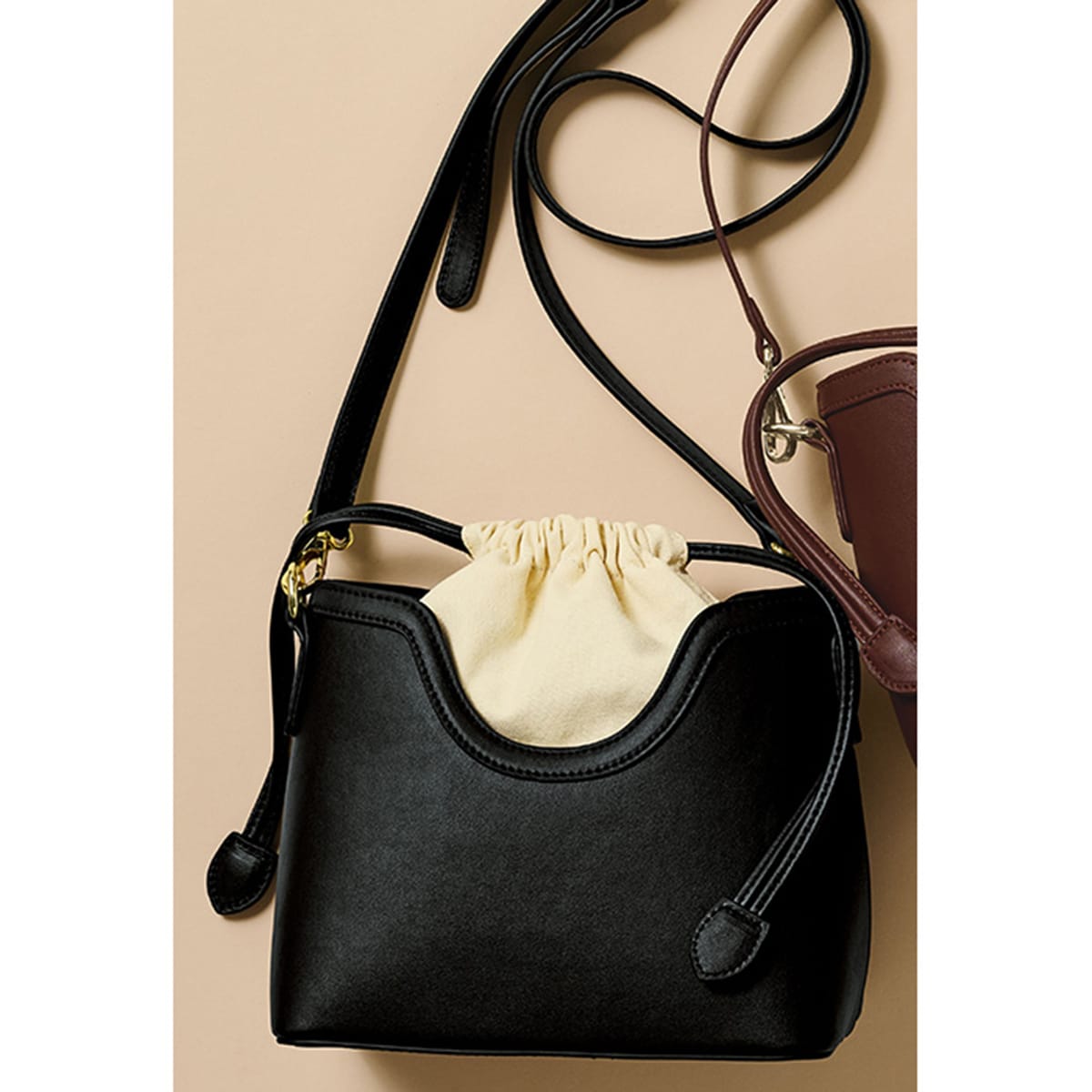 きちんとスタイルにも似合う、コロンと可愛いシルエットのショルダーバッグ。高級感漂うボディに、軽やかなキャンバス地の巾着をドッキングした技ありデザイン。