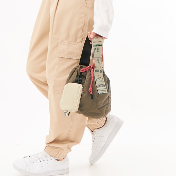 テープのワンハンドル持ちもでき、巾着ロープヒモを使って肩掛けも可能!
