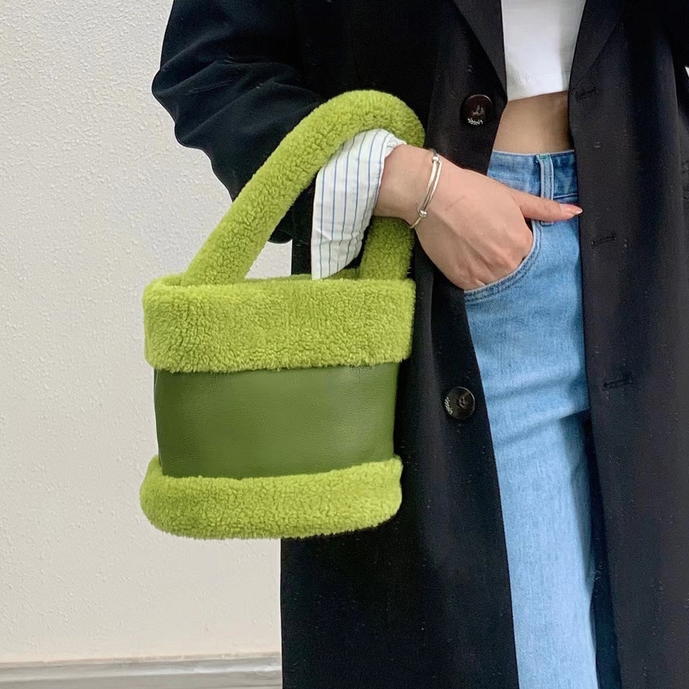 ふわふわのエコファーがルックのアクセントになるバケツバッグ
