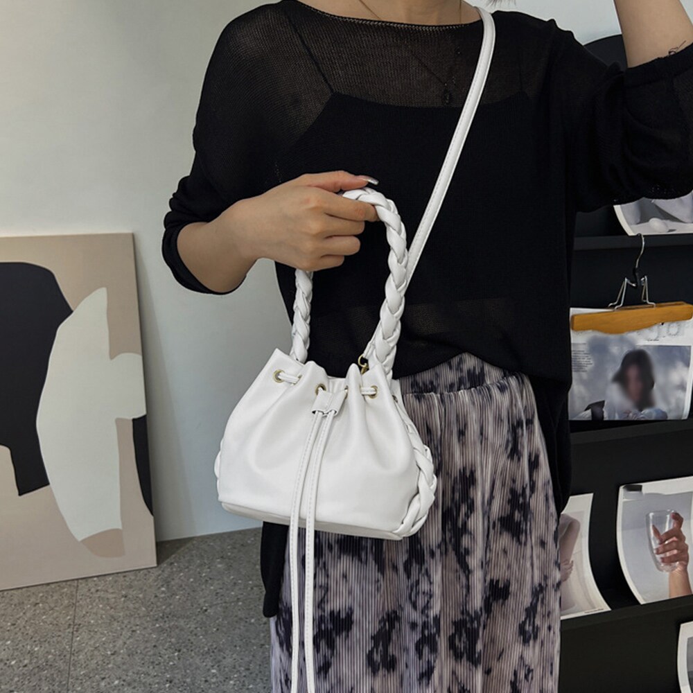 編込みデザインハンドルがアクセントをプラスする巾着ショルダーバッグ