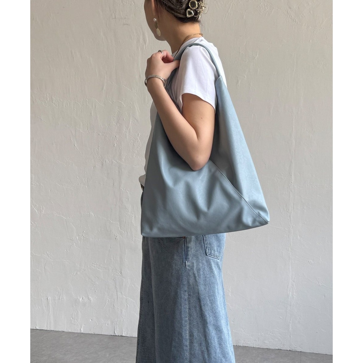 洗える合皮を使用した三角形のワンショルダーバッグ。