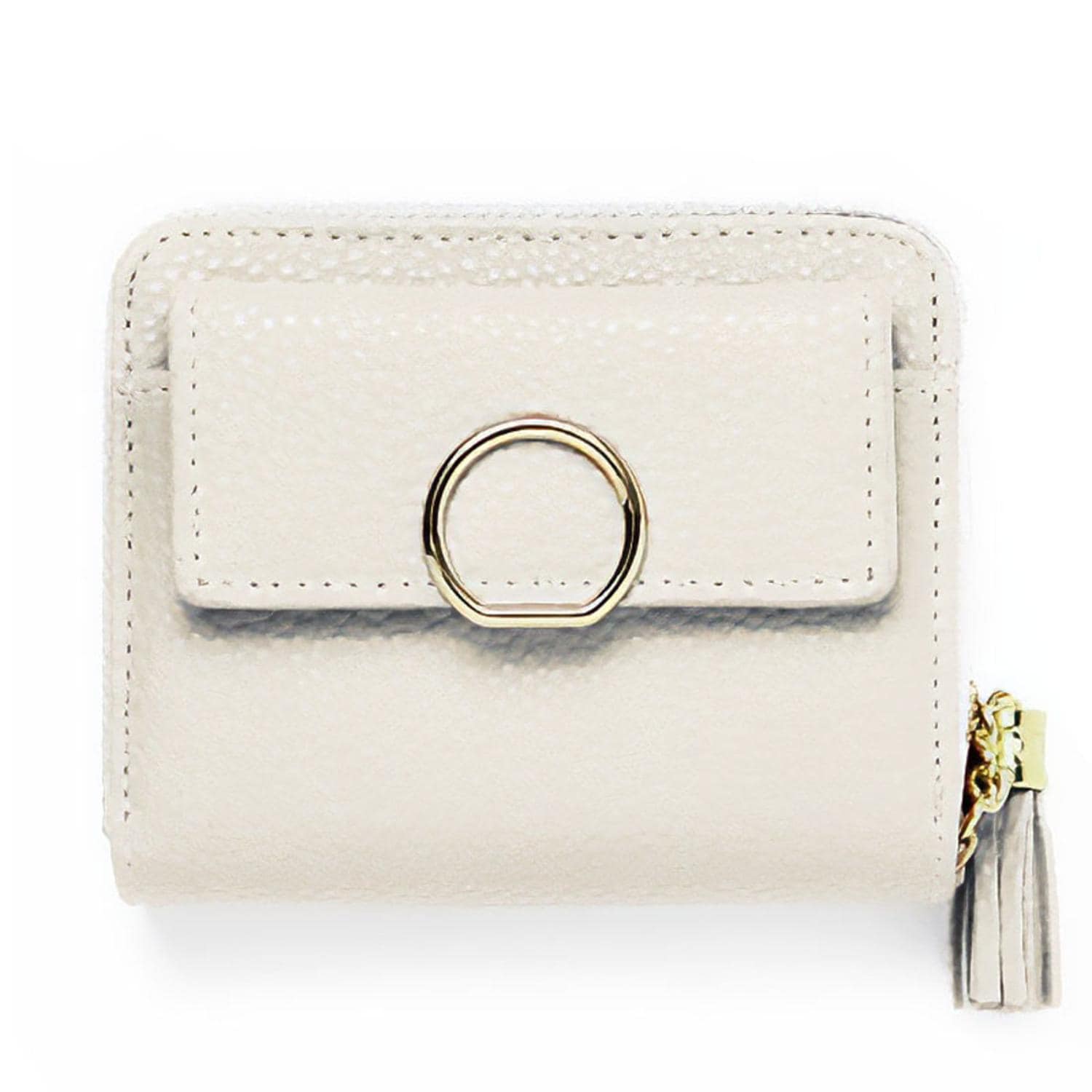 現金やカードがすっきりまとまる♪使い勝手の良い二つ折り財布。「Blanc Pomme タッセル付ミニウォレット」が新登場。【軽量&収まりの良いサイズ感】手に取りやすい軽さと、ミニバッグにも収納できるコンパクトなフォルム◎【サッと取り出せるフロントポケット】スナップボタンで簡単オープン。交通系ICなど、使用頻度の高いカードやレシートの収納に。【独立型の小銭入れ】小銭入れは、ぐるっと開くラウンドファスナー式。内側は2ルームに分かれており、中身がこぼれ落ちにくく取り出しがラクラク。会計時ももたつかない♪【シンプルなつくり】背面ルーム開口部はスナップボタン式。内側はお札やカードを見やすく収納できる仕様。【お手入れがラクチン】シボ感のあるフェイクレザー素材を使用。本革のような面倒なお手入れは不要◎【落ち着きのある大人可愛い仕上がり】マットな質感にゴールドの金具使いがアクセント。フロントのリングデザインやタッセルチャームの引き手もおしゃれ♪【ポケット仕様】最前面:スナップボタン式ポケット×1中央:ファスナーポケット(小銭入れ)×1背面ルーム:お札入れ×1、カードポケット×6、フリーポケット×2