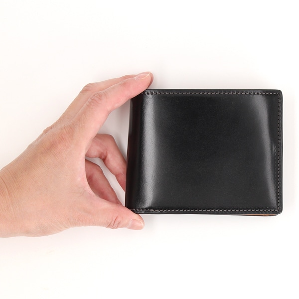 透明感のあるツヤ感が魅力の国産水染めコードバンを使用した二つ折り財布。