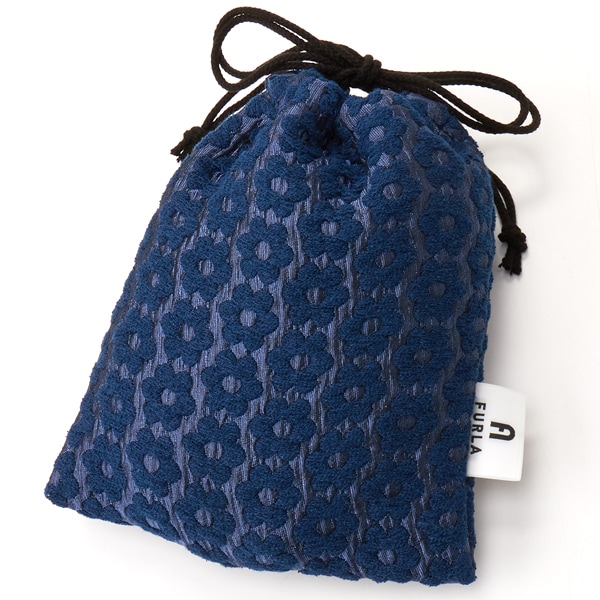 ふっくらと浮き上がるフラワーモチーフが可憐なデザイン。フルラらしいカラーコンビネーションが特徴のユニークな一枚を巾着に仕上げました。