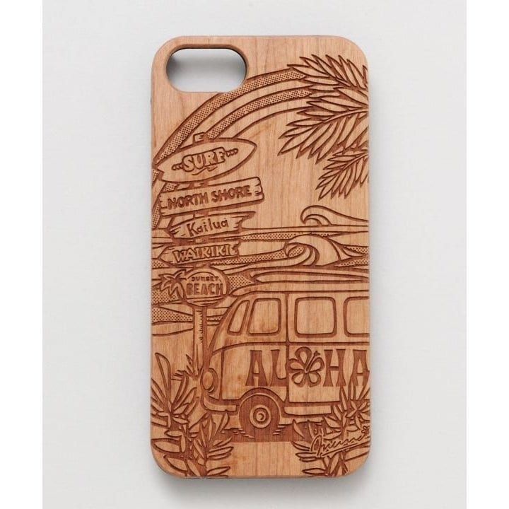 ウッドにレーザー加工したスマホケース。ワーゲンバス、ナンバープレート、ホヌ(海亀)とトライバル。どのデザインもウッドに描かれているので、落ち着いた雰囲のなかにハワイの力強さを感じられます。