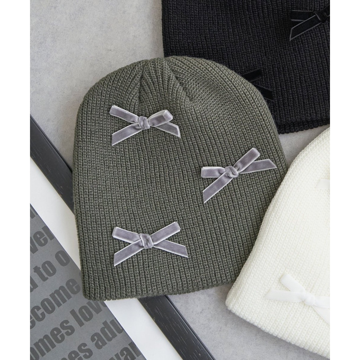 ベロア素材が魅力のリボンがアクセントのニット帽。