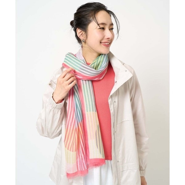 地柄模様のある素材に幾何とストライプのモダンで大胆なモチーフアレンジのストール。スプリングコートなどと合わせることで、華やかさを演出してくれます。薄手でとても柔らかな風合いなので、肌触りが良いストールです。大きめのサイズなので、ぐるりと巻いたり、肩にさっと掛けたりと様々なスタイルをお楽しみいただけます。