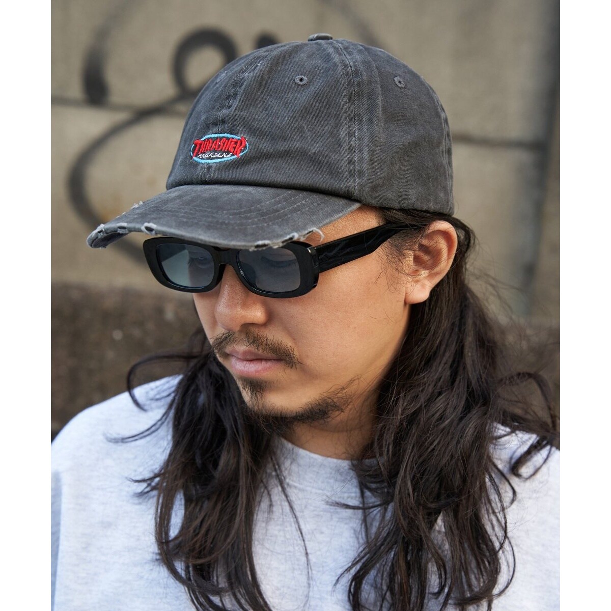 雰囲気たっぷりのダメージ加工が施された「THRASHER/スラッシャー」のベースボールキャップ。