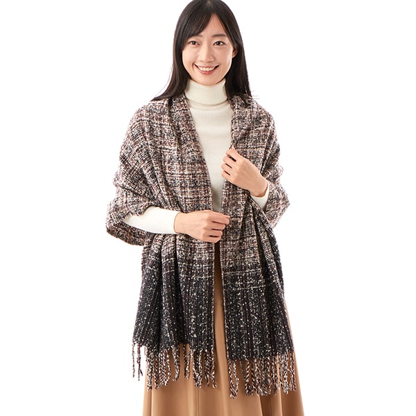 ツイード調のチェックストールはネップヤーンを使用しており、素材表面がメランジの独特の表情が楽しめます。