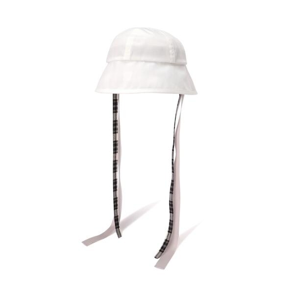 裏表に無地とチェックのテキスタイルを備えた2wayバケットハット。