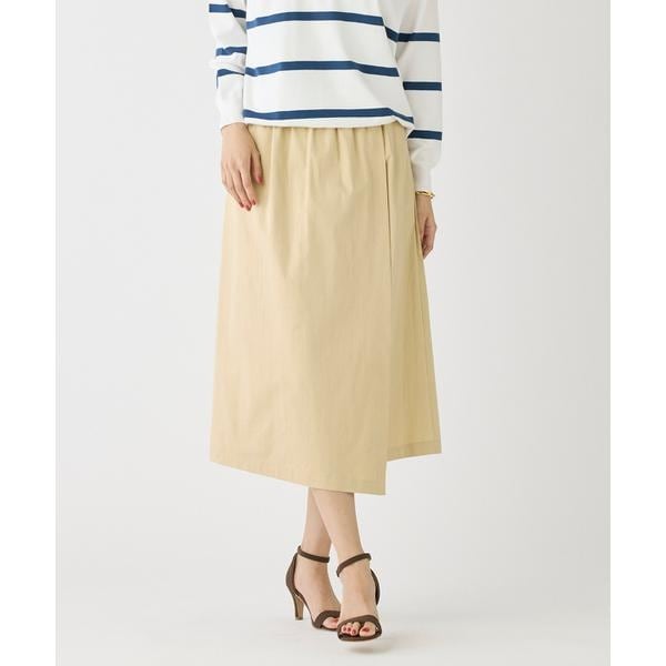 巻きスカートのような裾が斜めのカッティングがポイントのラップスカート。コットンのナチュラルなタッチとナイロンの軽さを併せ持った素材を使用しました。足さばき、ウエストのゴム仕様、着心地の良さにも拘りました。裾にかけて動きがでるため、シンプルなトップスと合わせてもこなれ感のあるコーディネートが完成します。・ウエストゴム仕様・左サイドファスナーあり・ポケットあり・水洗い可■素材■タテ糸にコットン、ヨコ糸にナイロン糸を使用したツイル素材。ポリウレタンを入れることでプラスされたストレッチ性と軽やかな素材感がつくりだす、ストレスフリーな着心地感が特徴です。また、環境に配慮したフッ素フリーの撥水加工を施しており、水溶性の汚れをはじきます。シワになりにくいイージーケア性もポイントです。■サンプル撮影商品■こちらの商品はサンプルでの撮影となっております。実際の商品とは、サイズや色味、素材、デザイン等の仕様が若干変更になる場合がございます。